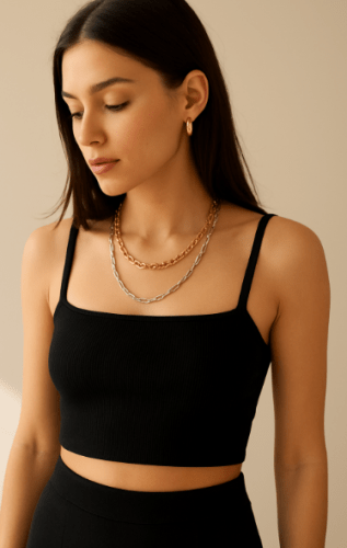 Вечерний образ: многослойные цепочки — золотая ближе к шее, серебряная длиннее.