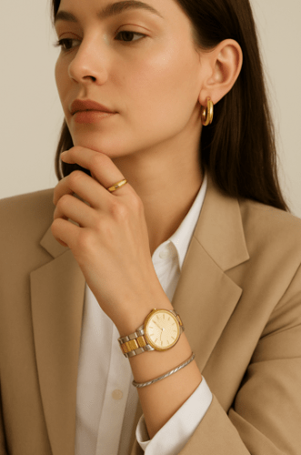 Офисный look: золотые часы + тонкий серебряный браслет на одной руке.